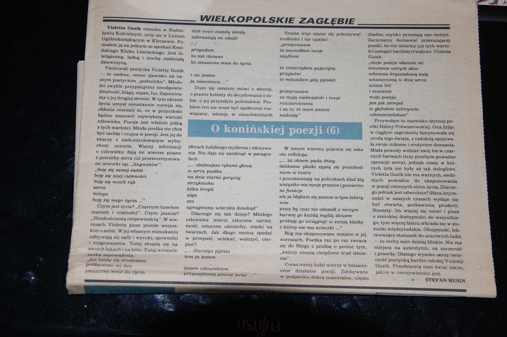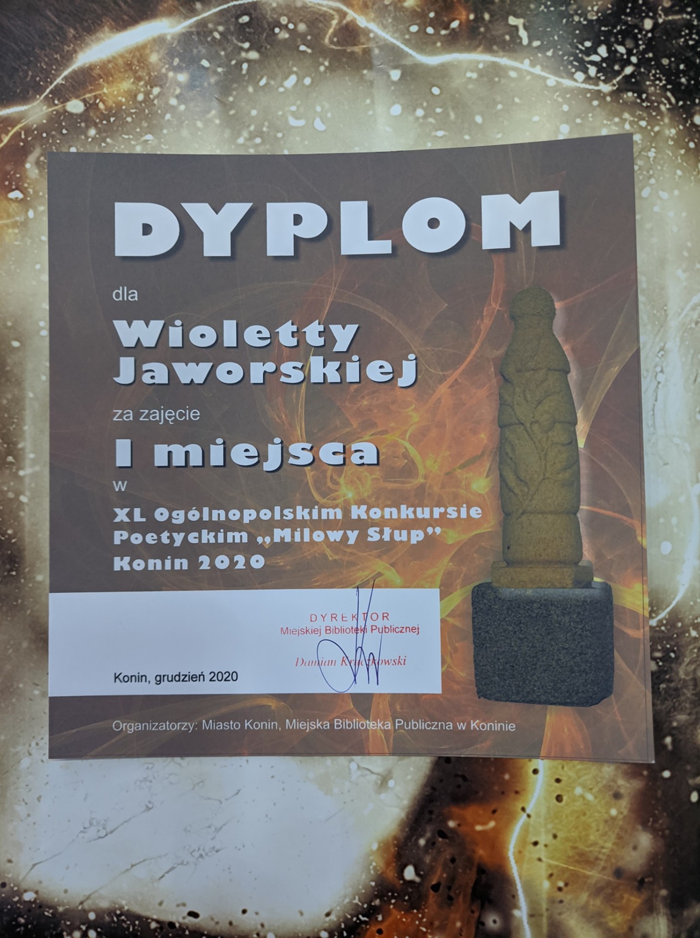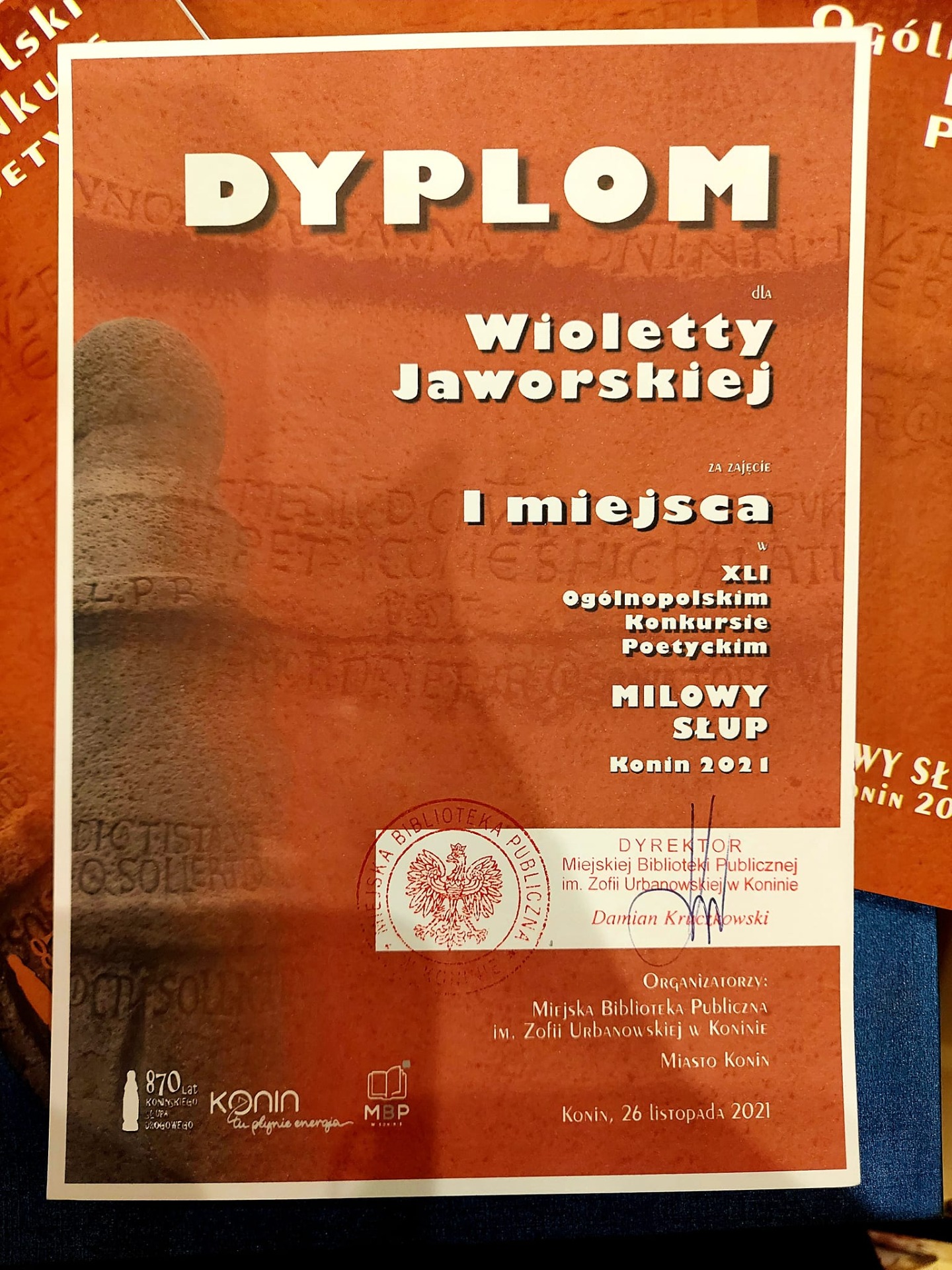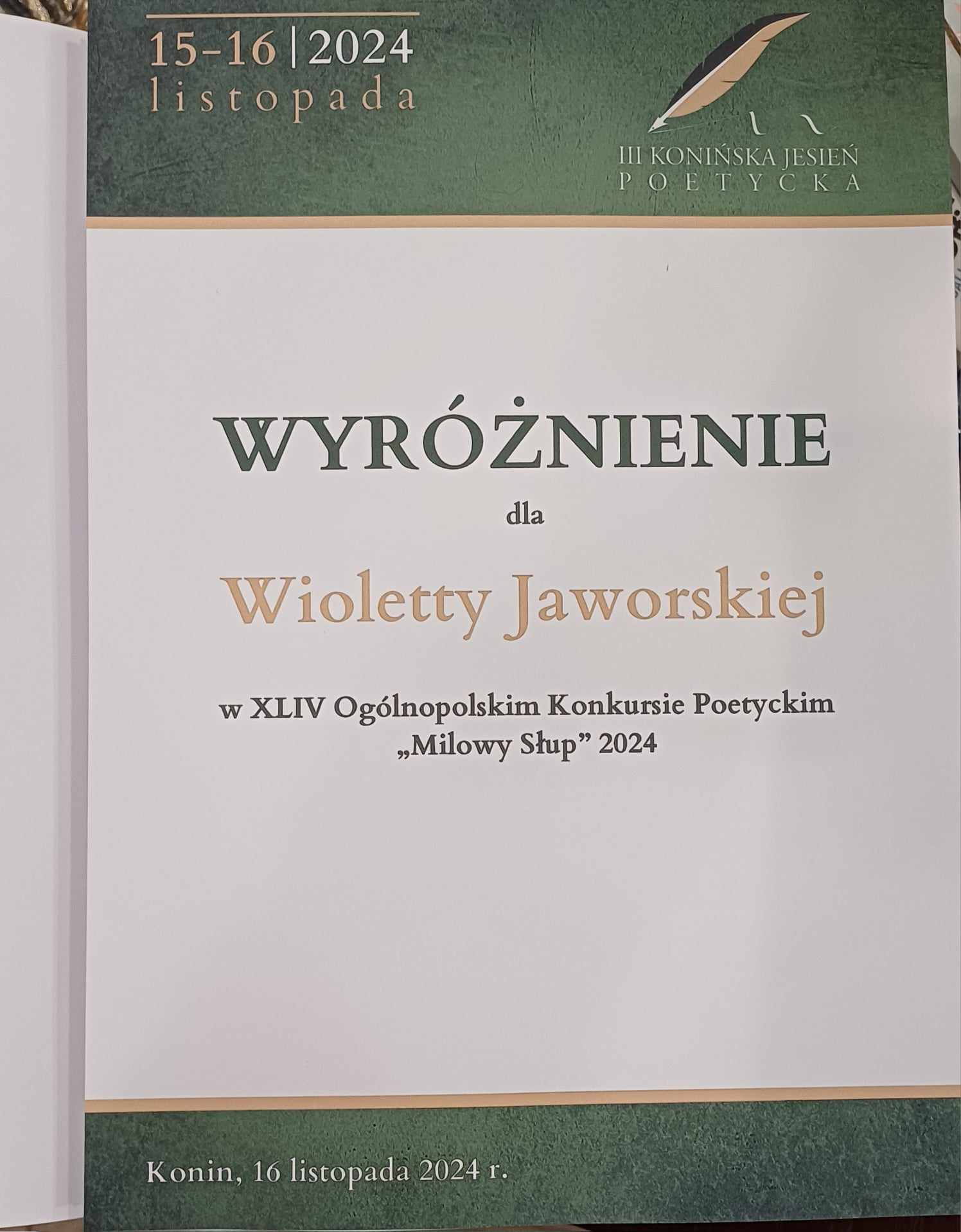 Z wdzięcznością przyjęłam podium w konińskim konkursie poezji - w 40. i 41 OKP "Milowego Słupa", a później jeszcze wyróżnienie w 44. OKP "Milowego Słupa". Konin na zawsze będzie moim poetyckim początkiem.